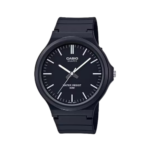 El Casio MW-240-1E se caracteriza por su diseño limpio y de excelente legibilidad gracias a su esfera negra con grandes índices blancos que contrastan claramente. Sus manecillas anchas facilitan la lectura incluso en condiciones de baja luz. Es un modelo pensado para quienes buscan practicidad con una apariencia simple y moderna.